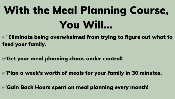 “This course has everything I need to figure out how to quickly plan a week's worth of meals for my family. Not only do I have control over what we eat each night now, but I’m able to do this in 30 minutes. I can’t thank you enough for this life-changing resource!”