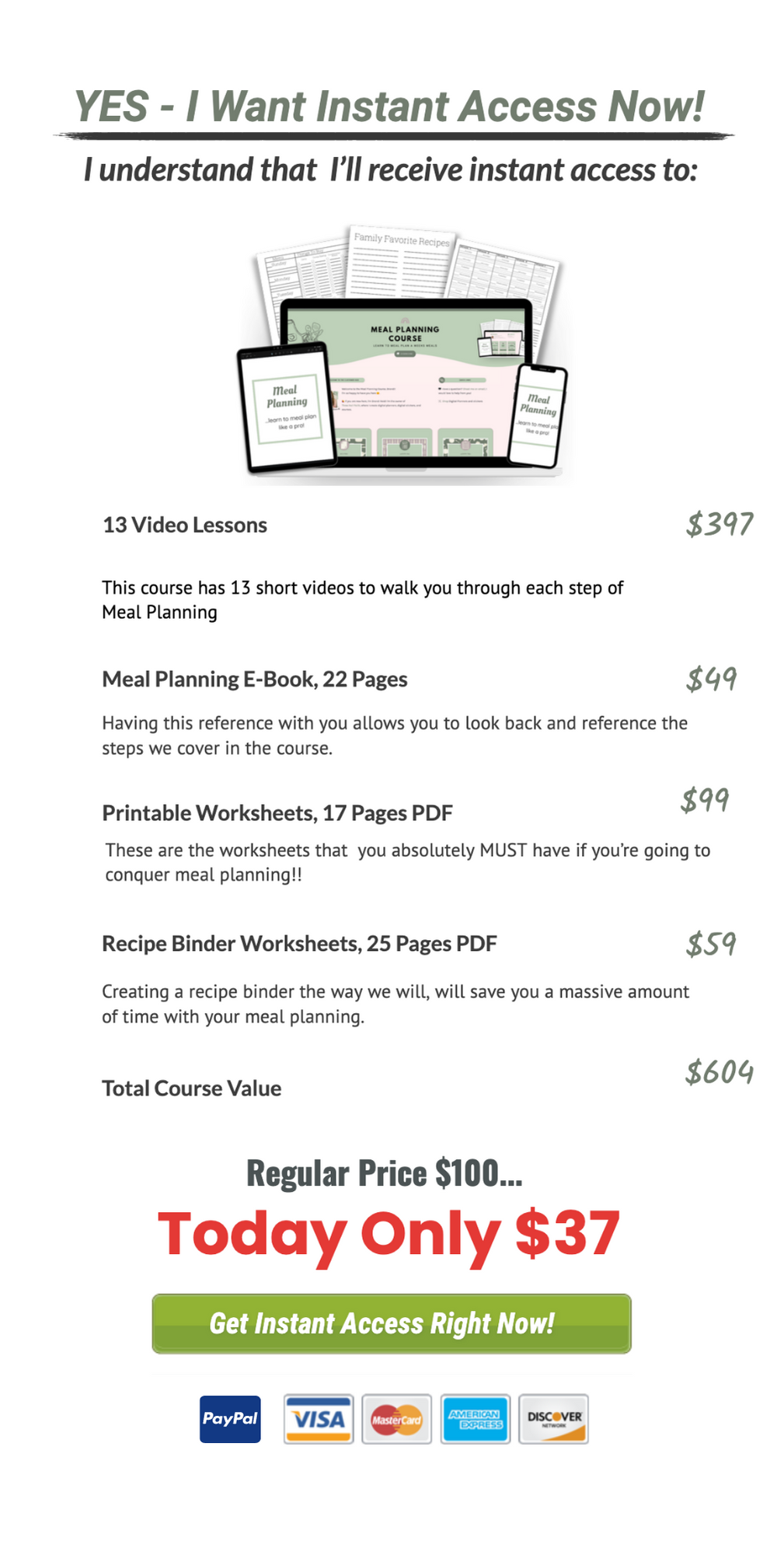 Thank you so much for creating this fantastic and easy step-by-step course on meal planning. I thank you, and my family thanks you!"